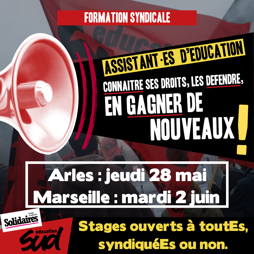 Pour la pause déjeuner de midi, SUD éducation prend en charge le repas des stagiaires. Une fois inscritE, nous vous contacterons pour les modalités pratiques.